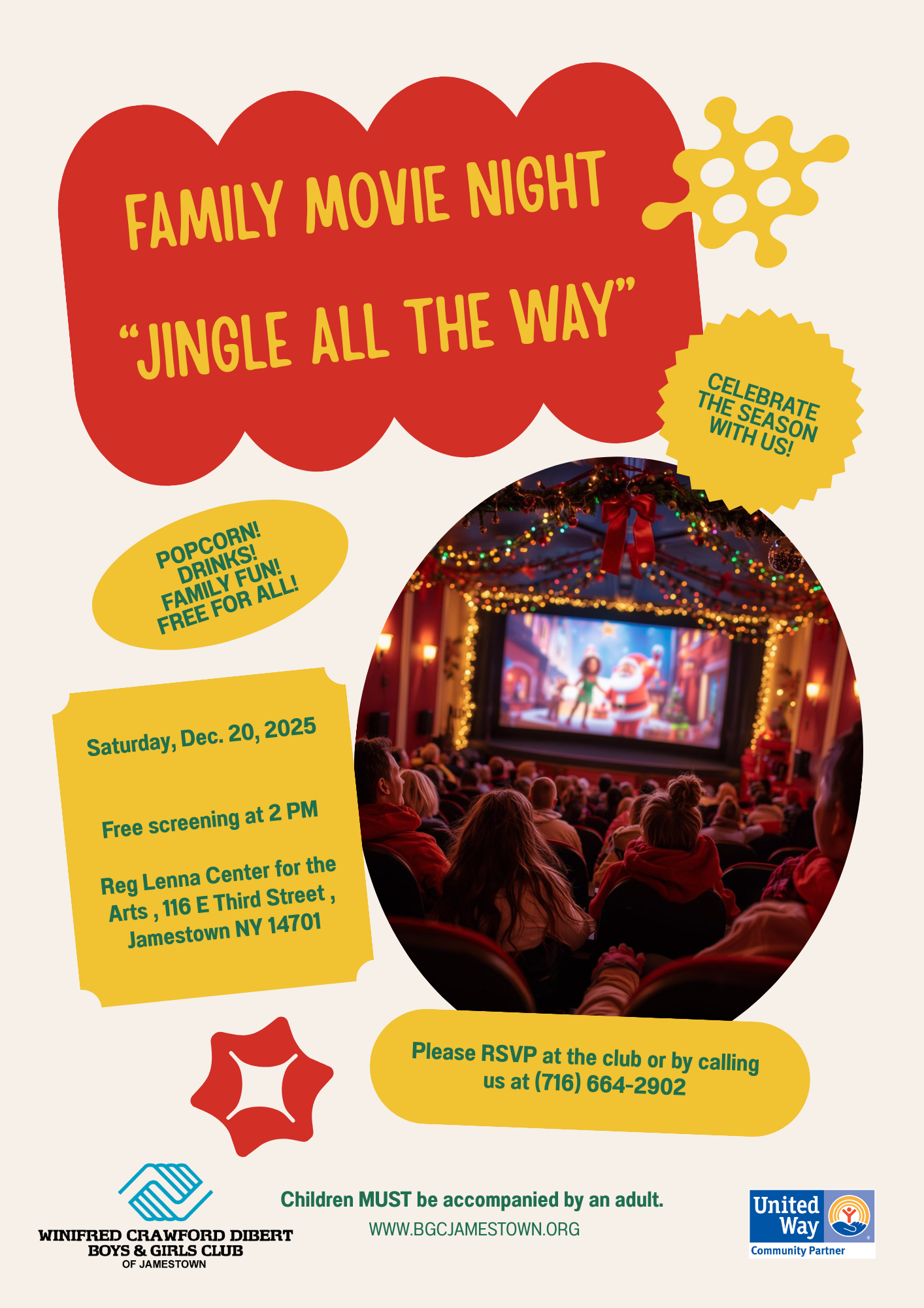 Family Movie Night-Call the Club to sign up! Parents/Grandparents/Friends/Neighbors-Adults & Children to come together-Free movie/popcorn and a drink!